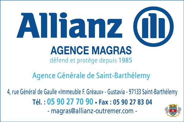 ALLIANZ AGENCE MAGRAS Saint Barthélemy Informations de contact 4, Rue Général de Gaulle. Immeuble F. Gréaux - Gustavia 05 90 27 70 90 05 90 27 83 04 magras@allianz-outremer.com Description Mots clés :assureurs, agnès magras, assurances Nous écrire Votre nom * Votre adresse de messagerie * Objet Votre message Je consens à ce que Teledom collecte, traite, stocke et utilise mes données personnelles en lien avec ce formulaire afin de pouvoir répondre à ma demande par la réception d'informations par e-mail. Veuillez consulter nos conditions d'utilisation pour plus d'informations.* Fiches similaires SHANA Boutiques de Vêtements - Prêt-à-Porter Backstreet 27 - Philipsburg 543 9740 Sint Maarten HOME DEPOT Équipement de la Maison Backstreet 71. - Philipsburg 542 5487 Sint Maarten VOYAGER 1 et 2 Navettes Maritimes Quai des Ferries - Gustavia 05 90 87 21 69 Saint Barthélemy MR TABLE CLOTH Linge de Maison Frontstreet 53 & 82. - Philipsburg 542 2193 Sint Maarten